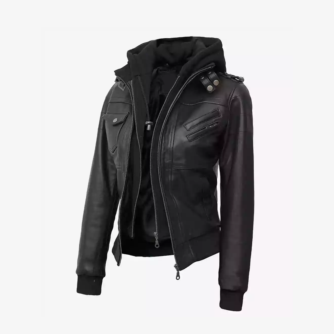 Women's Black Leather Hooded Jacket