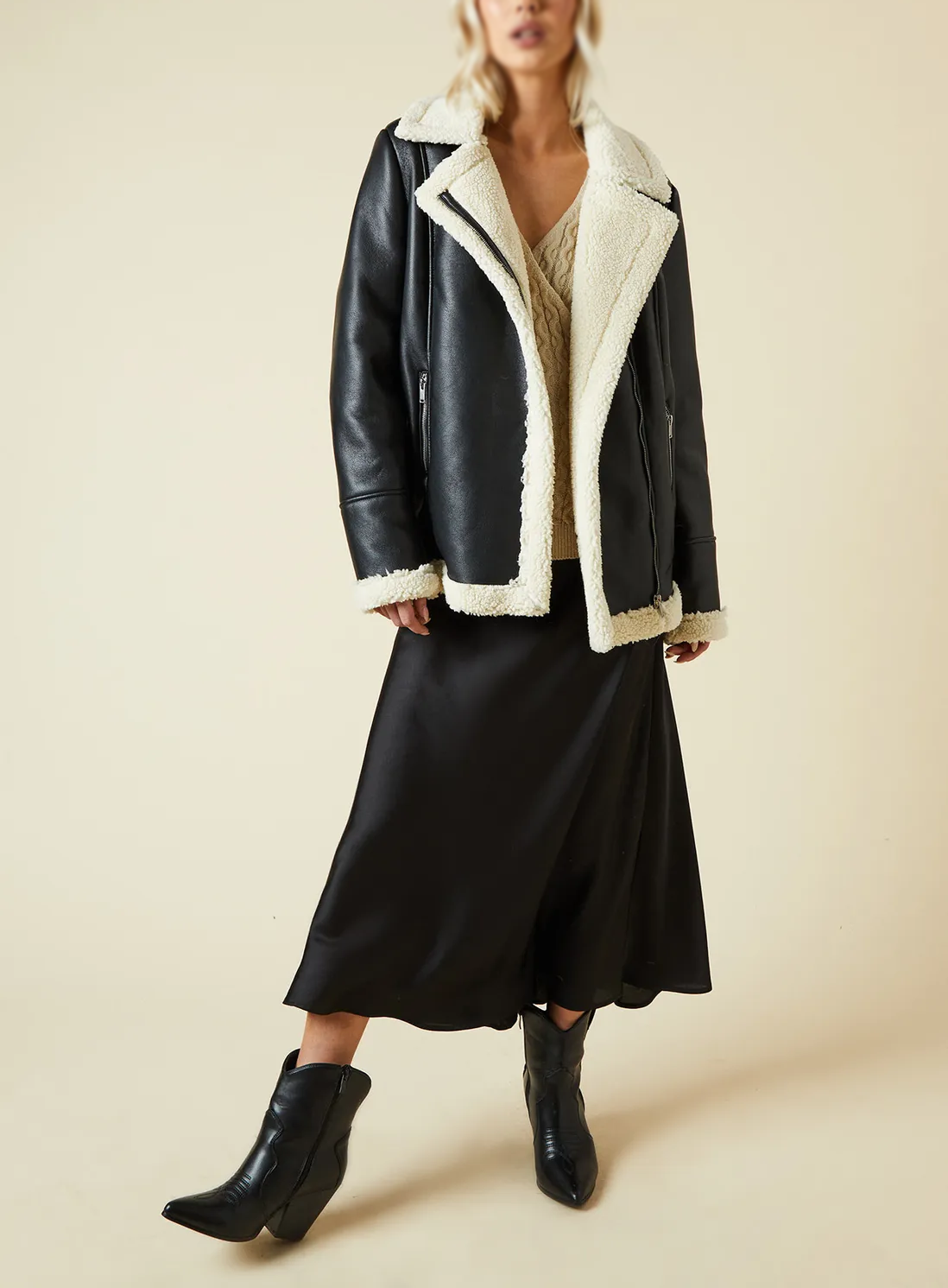 Women's Beige Sheepskin Shearling Aviator Leather Jacket