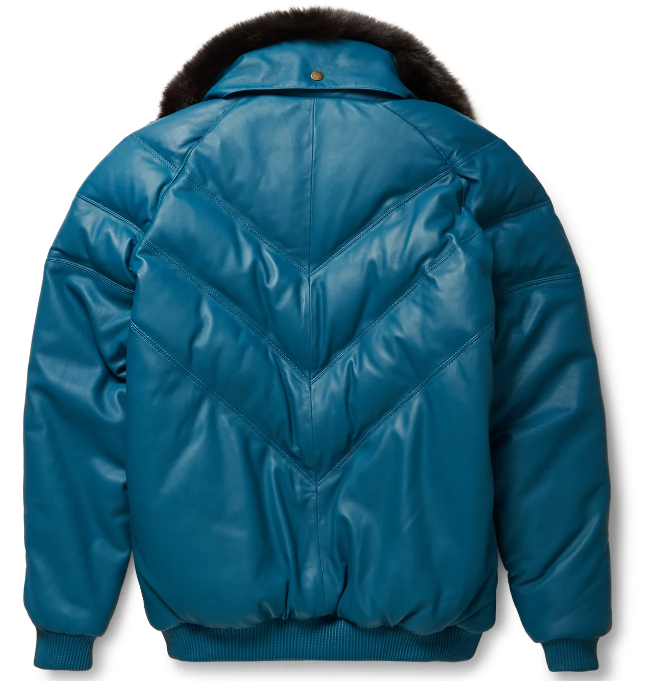 Men's V Bomber Shearling Collar Teal Leather Jacket